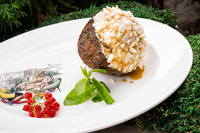 Кокосовый чизкейк (398 руб.) — подается в кокосовом орехе с мякотью кокоса и сырным тортом. Идеальная консистенция торта оттеняется стружкой кокоса и карамельным соусом. А вот карамели немного не хватило структуры до правильной формы. Но все на уровне. Оценка — очень хорошо.